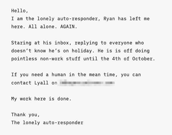 The out-of-office bot is lonely and bored — resentful of manual tasks, craving more responsibility, quietly dreaming of a promotion it would never get.